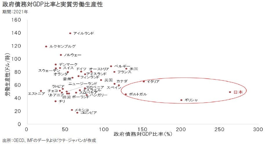 日本の歴代政権は、財政政策の拡大により、人口減少下において経済規模の維持を図ろうとしてきた。もっとも、政府債務対GDP比率が高い先進国の場合、生産性の高い国はない。短期的な経済対策の積み重ねが、長期的には潜在成長力のマイナス要因となる可能性が強いわけだ。政府の財政支出を日銀が金融政策で支える手法は、あくまで緊急避難策として有効なのではないか。