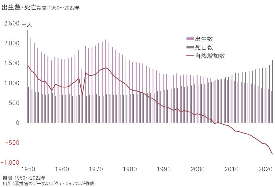日本の出生数は1975年に200万人を下回って以降、長期的な減少期に入った。第1次石油危機を契機に高度経済成長が終了、日本経済が成熟期に入ったことが背景だろう。また、医療の飛躍的な進歩により、乳児、新生児死亡数が劇的に減少したことも少子化の理由の1つではないか。昨年は死亡数が158万2,033人であり、総人口は前年に比べ78万2,305人、率にして0.6%減少した。