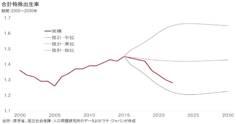 2022年の合計特殊出生率は、2021年の実績である1.30から1.27~1.28程度へ低下する見込みだ。2017年に国立社会保障人口問題研究所が公表した将来人口推計との比較では、国の政策の前提とされる中位推計ではなく、限りなく低位推計に近い推移となった。来年予定される5年に1度の年金財政再検証が、相当に楽観的な脚色を加えない限り、かなり厳しい数字となる可能性は否定できない。
