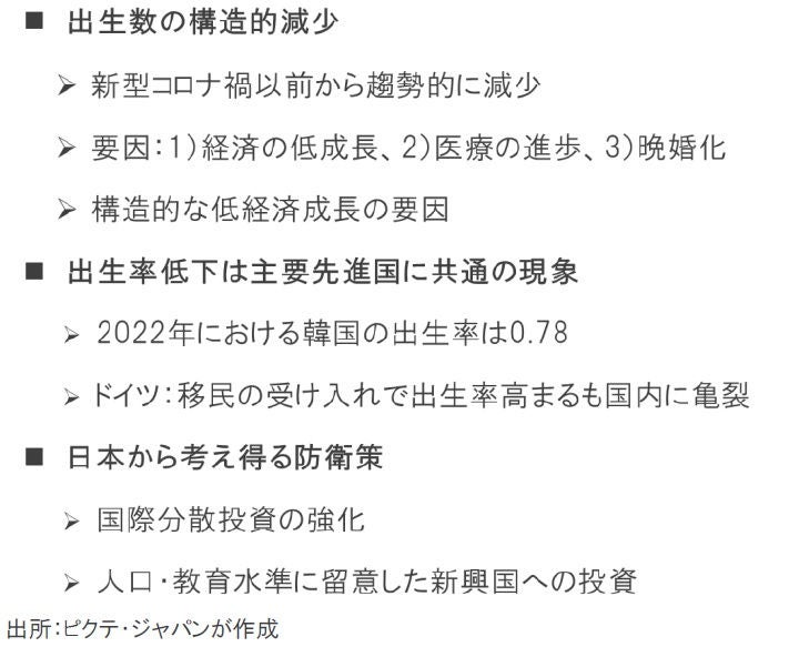 2月28日、厚労省は昨年12月の人口動態速報を発表、2022年の出生数は79万9,728人だったことが明らかになった。1899年の統計開始以来、初の80万人割れである。結果として、合計特殊出生率は1.27程度へ低下する可能性が強い。新型コロナ禍の影響はあるものの、日本の人口減少は構造的な問題と言えるだろう。人口動態は労働投入量を決める基盤であり、潜在成長率の一段の低下は避けられそうにない。また、来年に予定される5年に1度の年金財政再検証は、公的年金の持続可能性に関し厳しい結果となる可能性もある。もっとも、出生率の低下は主要先進国に共通の問題だ。米国や欧州諸国では、移民・難民を受け入れることでこの課題に対応してきた。その結果、ドイツなどにおいて出生率の反転が見られたものの、深刻な社会問題が起こり、極右勢力の台頭を招いている。今後、主要先進国は、人口が増加基調にあり、教育水準の高い新興国への投資を強化せざるを得ないだろう。人材は最も貴重・希少な資源と位置付けられそうだ。