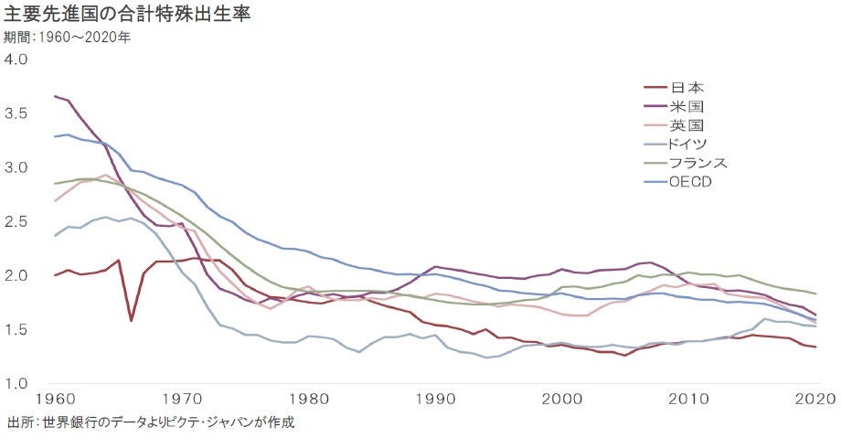 人口問題は主要先進国に共通の課題だ。医療サービスの充実した先進国の場合、人口維持に必要な合計特殊出生率は2.06~2.07とされる。「先進国クラブ」と呼ばれるOECD全体で見ると、2000年に1.83だった合計特殊出生率は2020年に1.59へと低下しており、人口維持の基準を満たしていない。2020年は新型コロナの影響を受けたと見られるものの、それ以前から趨勢的な低下基調にあった。