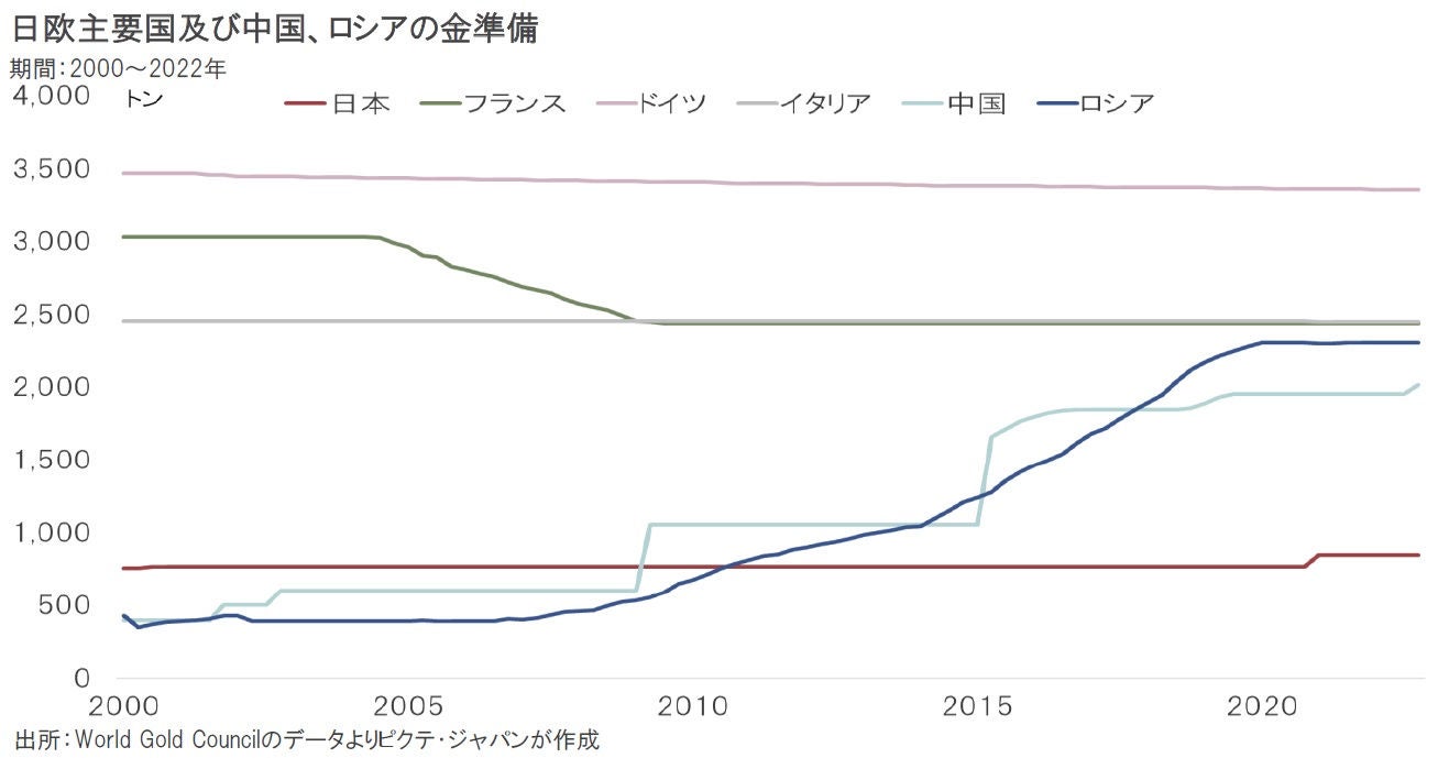 2000年における中国人民銀行(PBOC)の金準備は395トン、ロシア中央銀行(CBR)は422トンで日銀の754トンを下回っていた。ところが、昨年はPBOC2,011トン、CBR2,299トンで840トンの日銀を大幅に上回っている。この両国の外貨準備は金を増やす一方、米国国債のウェートを下げてきた。長期的な視点で自国通貨の価値の強化を図り、ドル経済圏からの離脱を図ってきたと言えるだろう。