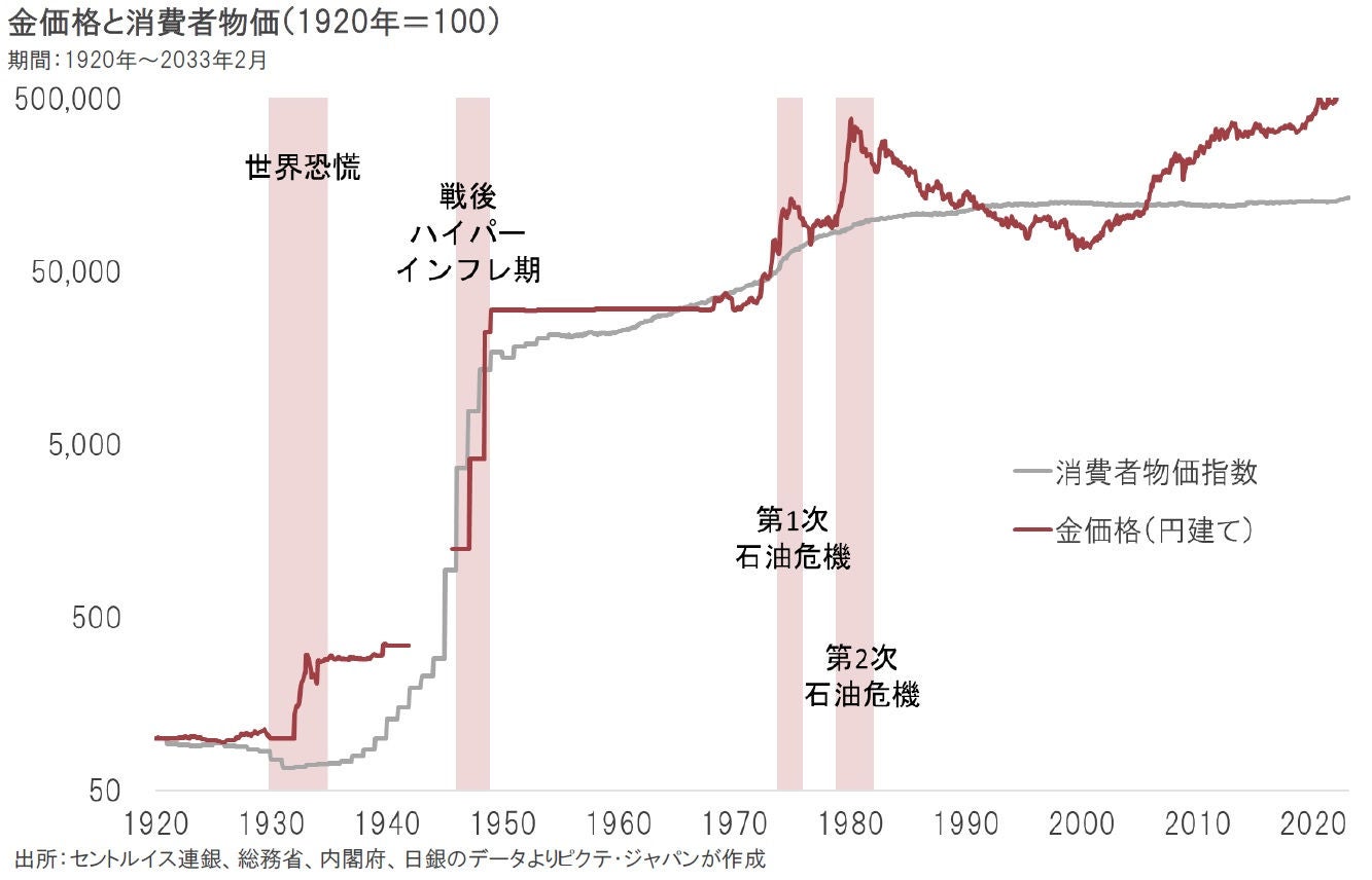 終戦直後のハイパーインフレ期、政府による預金封鎖もあって、多くの日本国民が金融資産の実質的価値を失った。ただし、金を保有していれば、通貨価値の急速な下落をヘッジすることができたのである。第1次、第2次石油危機においても、金は資産価値の防衛手段として十分に機能していた。通貨への兌換は既に停止されたものの、依然として金はインフレ局面においてその輝きを増すようだ。