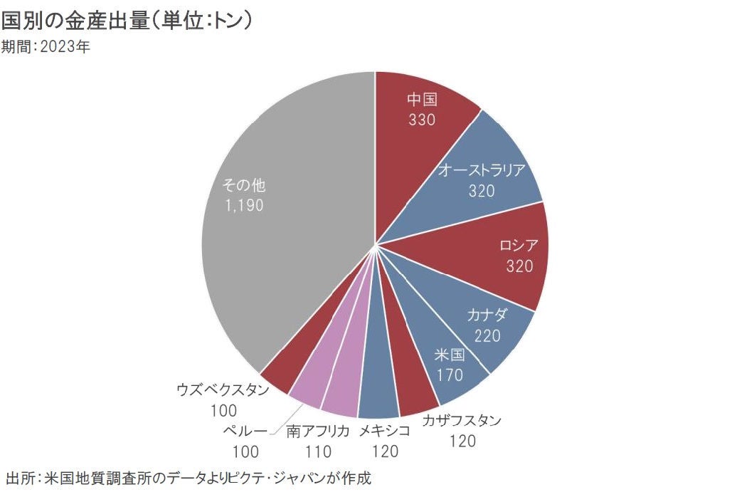 近年、中国が最大の金産出国になった。また、ロシアが中国、豪州に次ぐ3番目であり、レアアース、レアメタル同様、全体主義的傾向のある国が上位に目立つ。西側の産出上位国は豪州の他、カナダ、米国、メキシコなどだ。もっとも、産出上位国とは言え、その量が多いわけではない。今後、確認埋蔵量が減少するに連れ、既に利用されている金のリサイクルがより供給面での主要な役割を担うだろう。