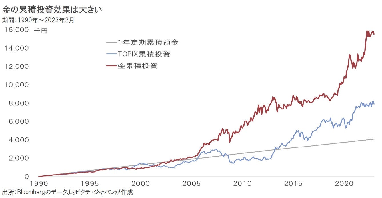 日本において資産バブルが崩壊、構造的なデフレに陥った1990年代に入って以降、毎月1万円を金、TOPIX、1年定期預金に累積投資・貯蓄したと仮定、資産価値の経過を見ると、利息・配当がないにも関わらず、金のパフォーマンスは相対的に良好だった。これは、デフレ下においても、ドルコスト平均を用いた金への累積投資を継続することが、長期的には有効である可能性を示していると言えよう。
