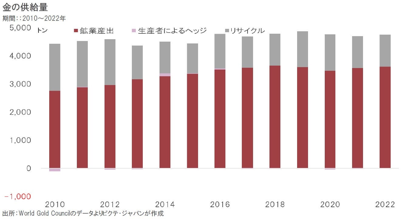 2022年までの10年間、金の年平均供給量は4,654トンだった。ただし、金鉱石から生産されたのは同3,478トンに止まる。残りのうち1,171トンは既に使用されていた金のリサイクルだ。新たに有力な金鉱脈が発見されて可採埋蔵量が増えない限り、このペースだとあと15年ほどで地下資源は枯渇する。この希少性に加え、耐久性、加工の容易性、美しさ、そしてポータビリティが、金の価値の背景と言えるだろう。