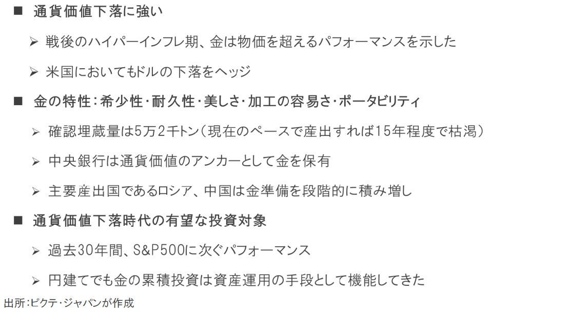 かつて金は通貨そのものであり、近代では金本位制の下で通貨価値を担保していた。しかし、1971年8月のニクソンショックでドルへの兌換が停止されて以降、金は法的には数あるコモディティの1つに過ぎない。また、利息・配当がなく、本来、投資用資産としては扱い難い。それでも、米国FRBを筆頭に世界の主要中央銀行は今も金を資産として保有、通貨価値を安定させる最終的なアンカーとして活用してきた。また、終戦直後のハイパーインフレ期を含め、金を保有することにより、日本では資産価値下落のリスクをヘッジできたのである。米中両国の覇権争い、ロシアによるウクライナ侵攻などから、国際社会は分断による構造的なインフレ期に入った可能性が強い。先行きの不透明感が強まりつつあるなか、金の持つ希少性、美しさ、強靭性、加工の容易さ、ポータビリティが、インフレへのヘッジ手段として再評価されるだろう。巨額の公的債務に加え、過剰な金融緩和が長期化するなか、日本の家計にとり金によるリスクヘッジは有力な検討対象ではないか。