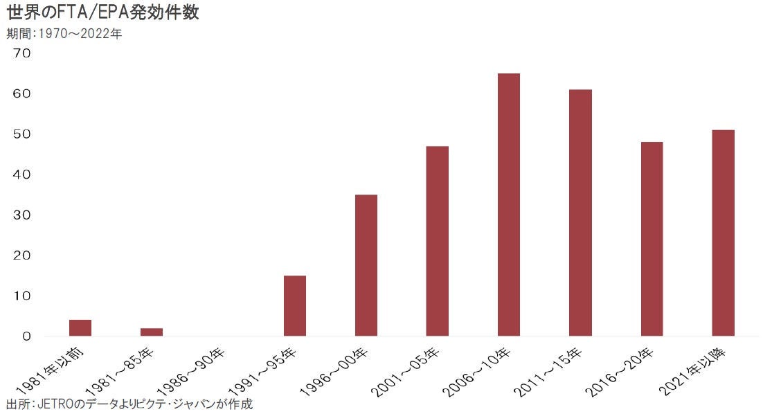 1990年末まではGATTの下での交渉の枠組みが機能しており、結ばれたFTA/EPAは6件に過ぎなかった。これが大きく変化したのは、ドーハ・ラウンドが実質的に頓挫した2000年代であり、現在までに328の協定が発効している。日本は2002年にシンガポールと初のEPAで合意して以降、米欧主要国に比べて出遅れが指摘されていた。しかし、TPP、RCEPの交渉を主導し、現在は20の協定を締結している。