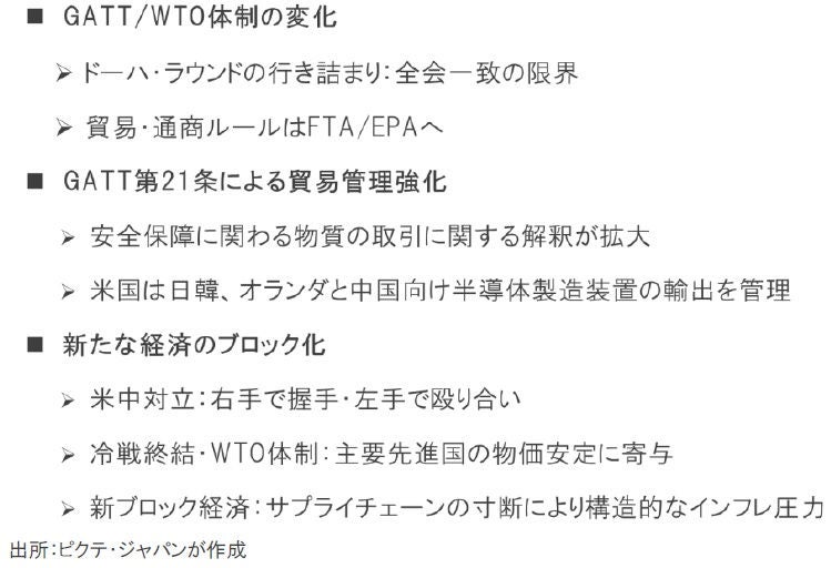 3月31日、岸田内閣は『外国為替及び外国貿易法』(外為法)に基づく『輸出貿易管理令の一部を改正する政令』を閣議決定した。この変更で、新たに半導体製造装置23品目が厳格な輸出管理の対象になると報じられている。政府は対象国を明示していないが、対中輸出が標的であることは明らかだ。昨年10月に米国政府が発表した半導体関連の輸出管理に呼応した今回の措置は、安全保障に関わる例外を規定したGATT第21条を根拠としている。ただし、拡大解釈の感は否めず、WTOの原則に抵触する可能性は否定できない。この件が象徴するように、WTO体制による貿易ルールは既に形骸化しつつあり、世界は親和性のある2国間、多国間の自由貿易協定(FTA)、経済連携協定(EPA)が実質的な国家グループのルールを決めるブロック化の方向へ向かっているようだ。それは、世界経済の分断が進んでいることを象徴するだろう。結果として、サプライチェーンの最適化が阻まれ、コストの上昇による構造的なインフレ期に入った可能性は否定できない。