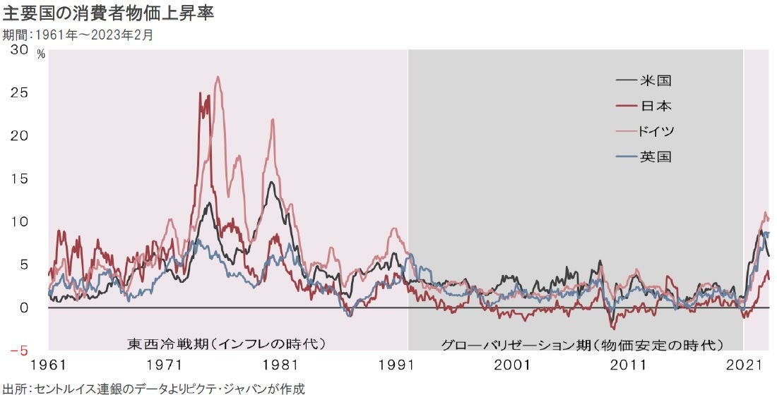 東西冷戦期は、分断によるコスト高により「インフレの時代」だった。一方、旧ソ連崩壊後は、グローバリゼーションの下での「物価安定の時代」と言える。しかしながら、米国主導の半導体関連の輸出管理強化に象徴されるように、世界は再び分断の時代に突入しつつあるようだ。重要品目においてサプライチェーンが寸断される結果、コストが上昇し、インフレ率は構造的に高まることが予想される。