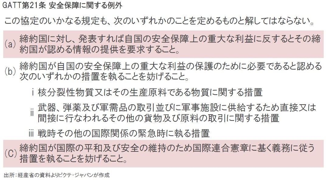 貿易ルールを定めたGATTは、第21条で加盟国が安全保障上の理由からGATTの義務に反する貿易制限措置を採っても、「自国の安全保障上の重大な利益に反する」と判断されるなど3つの要件の何れかを満たす場合、その措置は正当化されると規定している。自由貿易の原則に関する例外であり、主権国家にとって重大な意味を持つ安全保障と国際的な貿易ルールのバランスを図る意味で設けられた。