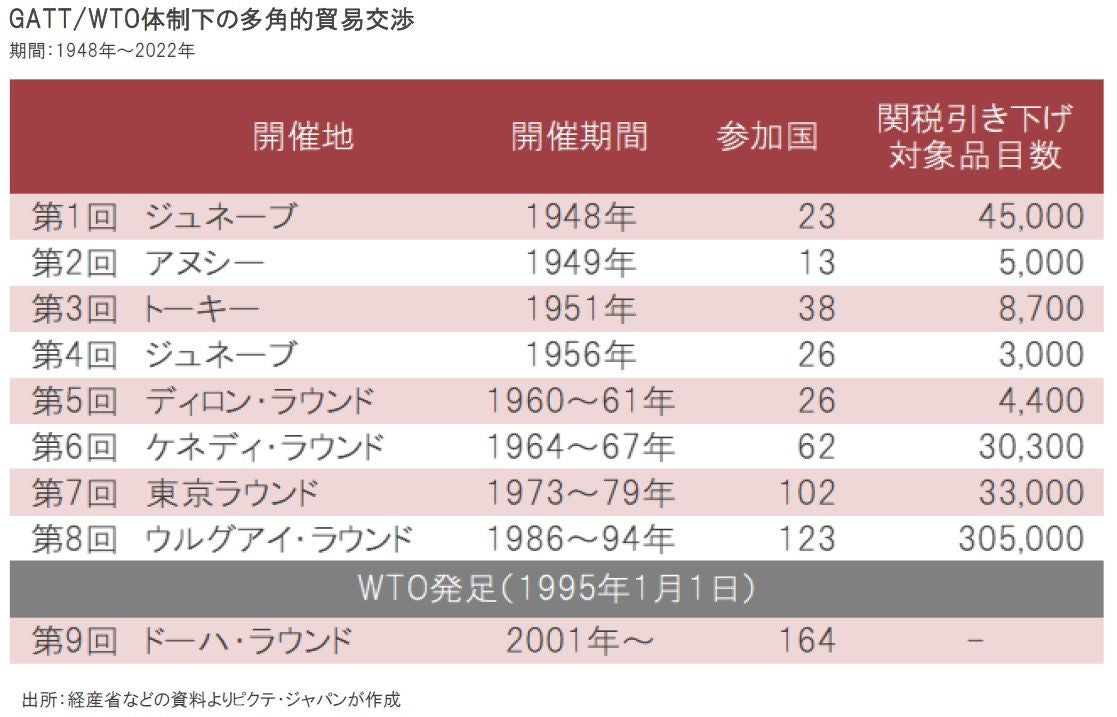 1995年1月、世界貿易機構(WTO)が発足した。『関税及び貿易に関する一般協定』(GATT)を背景に締約国が8次に亘り国際的なルールを決めてきたが、ウルグアイ・ラウンドの交渉の過程で常設機関が必要とされたのだ。もっとも、164ヶ国が参加し、全会一致が必須とされるなか、2001年に始まったドーハ・ラウンドはまだ決着のメドが立っていない。これが、WTOが形骸化しつつある要因と言えよう。