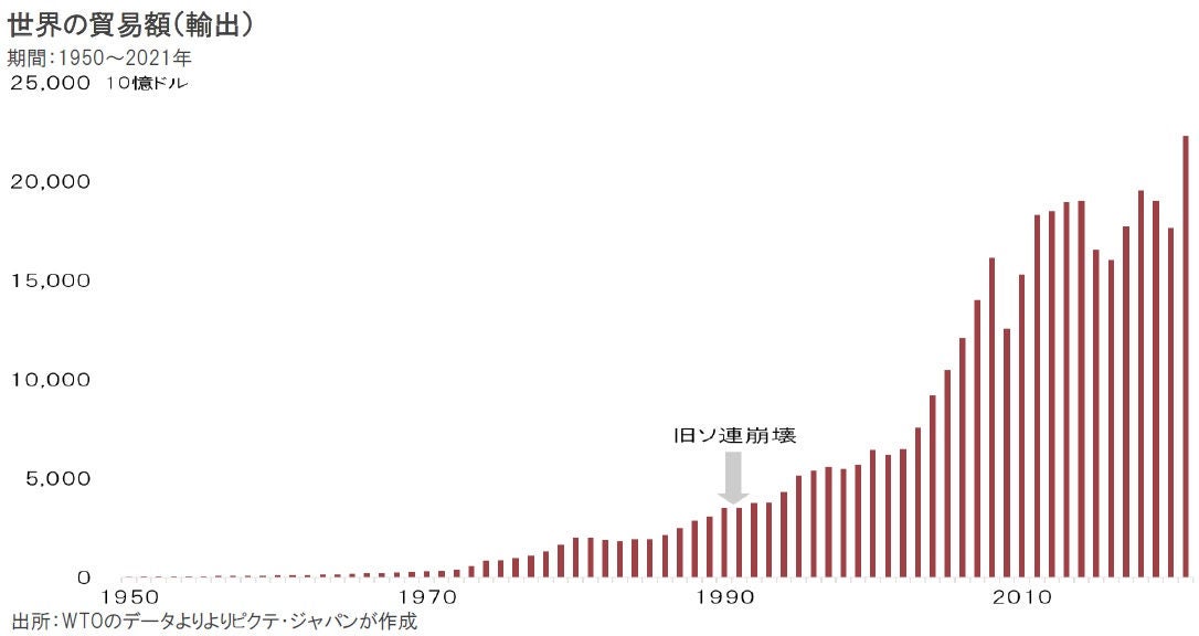 1991年12月に旧ソ連が崩壊し、1995年1月にWTOが発足して以降、世界の貿易取引は飛躍的に拡大した。1992年から2021年までの30年間、貿易額は年率6.4%のペースで伸びている。冷戦下で世界を分断していた東西の壁が取り除かれ、米国主導の下で世界のサプライチェーンが統合されたからだろう。世界が再び分断に向かえば、少なくとも部分的に自由貿易体制が崩れるのではないか。