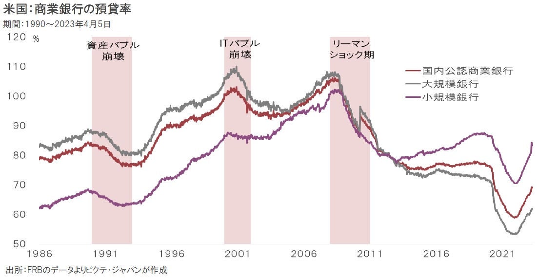 米国の商業の預貸率は、4月第1週の時点で大規模銀行62%、小規模銀行83%、全体で69%である。一方、ITバブル崩壊期、リーマンショック期は、預貸率が100%を超えており、金融システム不安により預金が引き出されると、貸出の回収、資産の売却を迫られた。それが損失の実現を通じて銀行の体力を奪い、信用収縮が深刻化する極めて大きな要因だったと言える。この預貸率は、過去2回の金融危機との大きな違いだ。