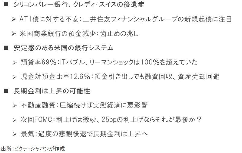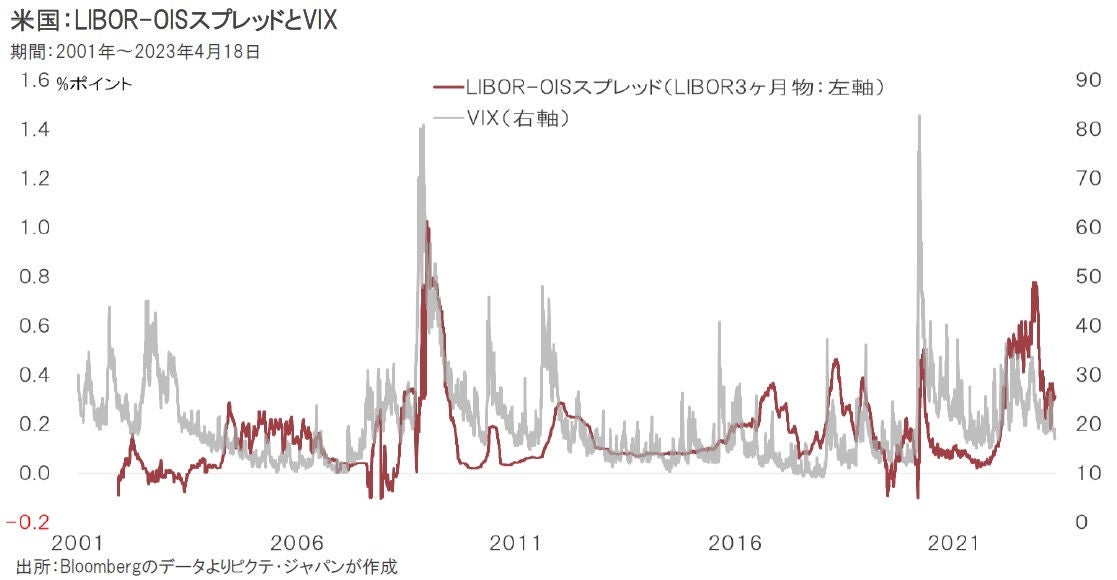 SVBの破綻後、日米欧の主要市場では長期債が買われる一方、株価が下落するなど、マーケットに動揺が広がった。もっとも、インターバンク市場における銀行相互の取引リスクを示すLIBOR-OISスプレッドは、リーマンショック時と異なり落ち着いていた。また、S&P500のインプライドボラティリティであるVIXも低位安定だ。これは、市場が金融のシステミックリスクが高いとは認識していない証左だろう。