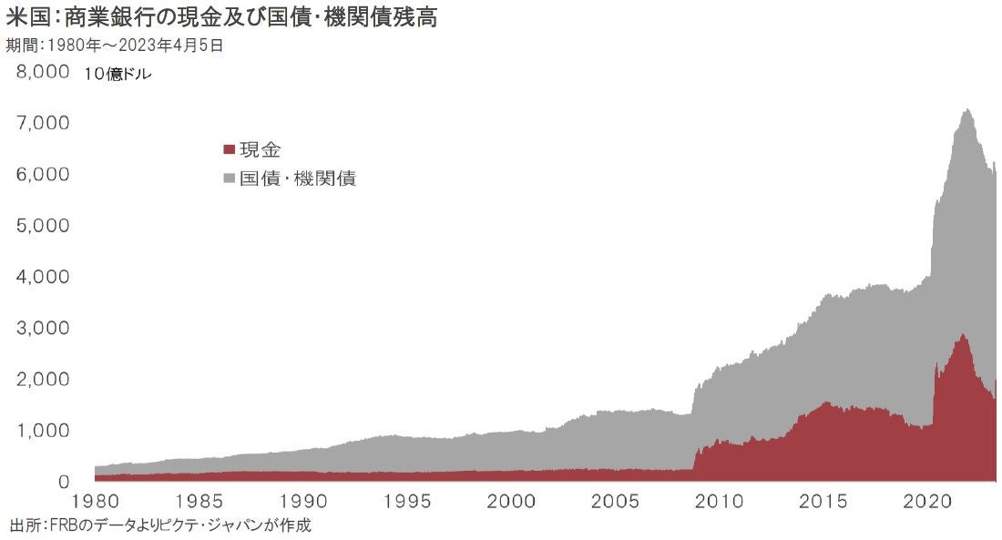 現状、米国の商業銀行は預金残高の12.6%に相当する2兆76億ドルの現金を保有している。3月の預金残高の減少額は3,844億ドルであり、マクロ的に見れば、預金の引き出しには十分に対応可能だろう。小規模銀行も4,589億ドルの現金を有し、預金残高の8.6%をカバーしている。リーマンショック、新型コロナでFRBが歴史的な資金供給を行い、それが現金として銀行の資産に積み上がった結果だ。
