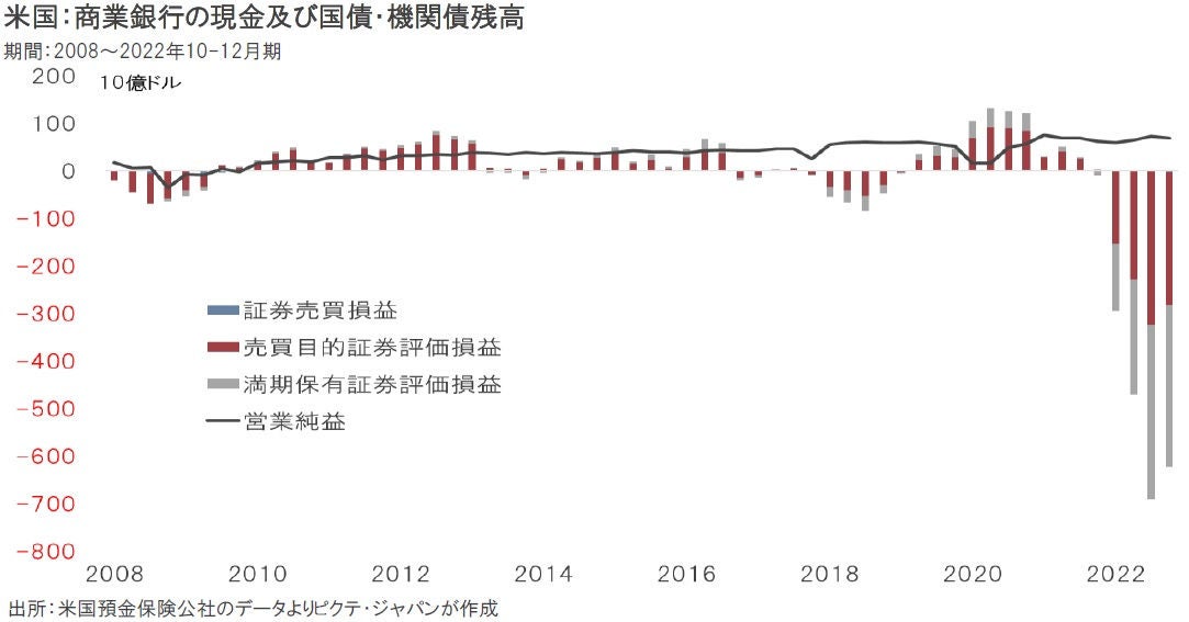 連邦預金保険公社(FDIC)によれば、米国の商業銀行は昨年末時点で保有する国債・機関債に6,204億ドルの含み損を抱えていた。もっとも、銀行が満期保有を前提に償却減価方式で会計処理を行っていれば、含み損が経営を不安定化させることは考え難い。問題は預金が流出し、現金では支払いができなくなる結果、資産の売却を迫られるケースだ。その場合、SVBのように含み損が実現損になる。