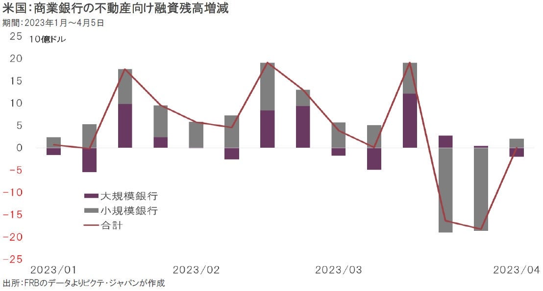 金融不安に伴って信用収縮が起こった場合、現状、最も懸念されるのが不動産市況だ。過去5年間、小規模銀行の商業用不動産融資は年率9.1%のペースで伸びており、それが米国の不動産価格を押し上げる一因だった。この融資が止まれば、事業者が手持ち不動産の現金化を加速、不動産市況に大きな影響が出る可能性は否定できない。リスク要因として今後の動向に注意が必要だろう。