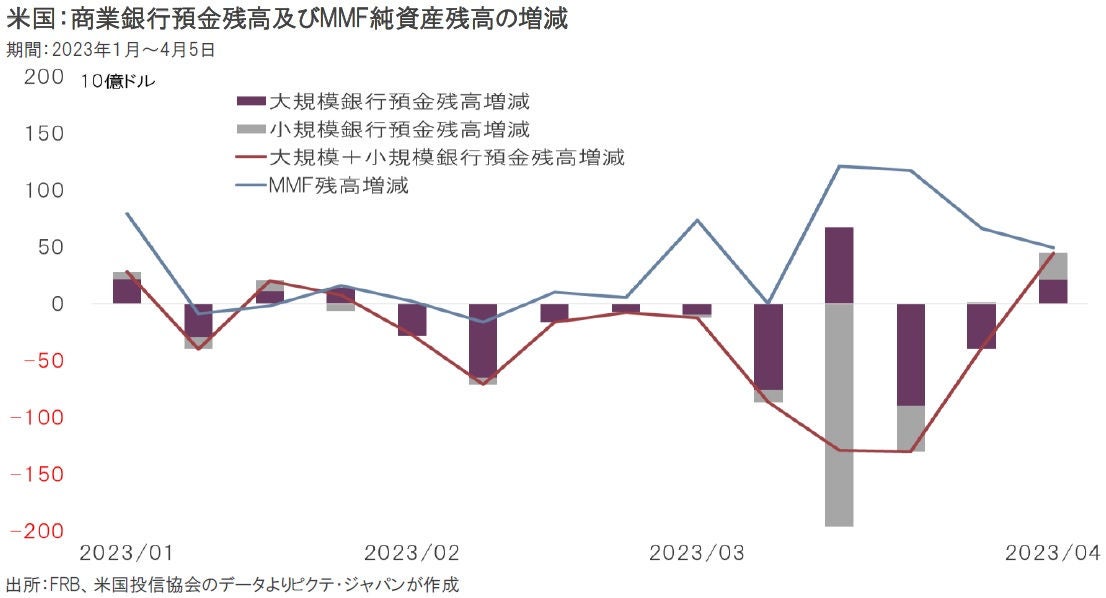 米国では年初から3月末まで5,031億ドルの預金が流出、その92.0%に相当する4,631億ドルがMMFへ流入した。大規模銀行の預金残高減少率2.3%に対し、小規模銀行は4.6%に達しており、経営基盤が相対的に弱い地方金融機関から預金が引き出されてきたと見られる。もっとも、4月第1週、10週間ぶりに米国の商業銀行の預金残高が増加した。預金流出に歯止めが掛かるのか注目されよう。