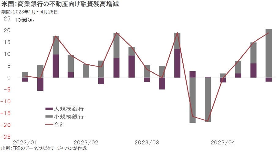 シリコンバレー銀行(SVB)の破綻以降、米国の銀行は預金の引き出しに対応するかたちで不動産融資を絞った。しかしながら、4月に入って以降は再び増加に転じている。商業銀行の預貸率は69%と極めて低く、預金に対する現金の比率は13%に達している。預金の引き出しがあっても、融資回収や資産売却を急ぐ状況にはない。それが安心感を醸成、マクロ的には預金流出も止まりつつある。