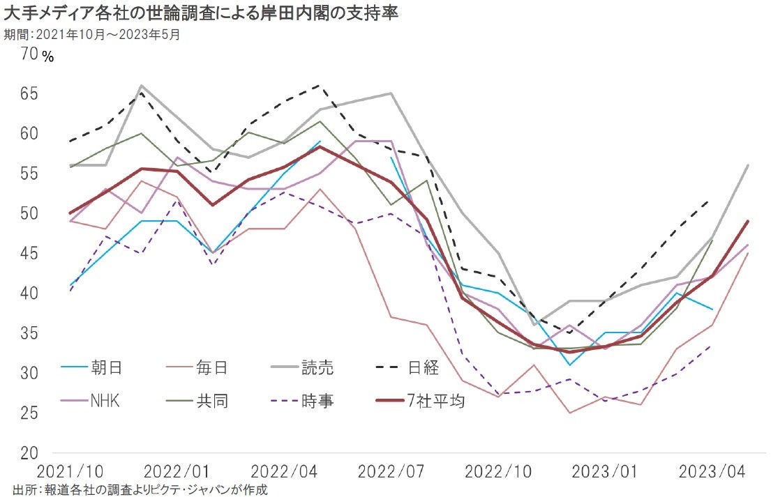 岸田内閣の支持率は、閣僚の相次ぐ更迭に加え、統一教会問題が顕在化したことで、昨年後半は低下基調をたどった。しかし、今年に入って外交への評価から回復に転じた上、G7広島サミットは岸田首相にとり強い追い風となったようだ。各国の首脳が揃って平和記念公園を訪問した上、ウクライナのゼレンスキー大統領が来日、G7の結束が高まったとの感を日本の有権者が強く受けたからだろう。