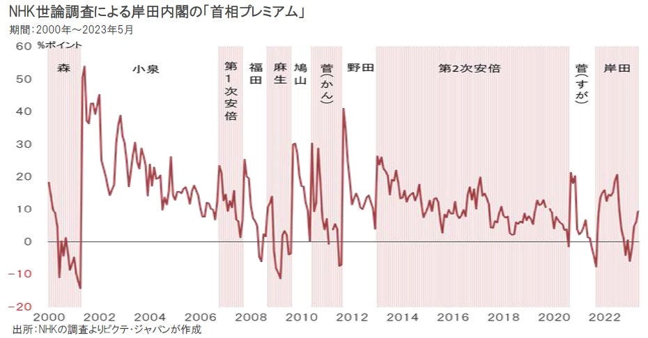 内閣支持率は、概ね内閣総理大臣の支持率と言える。そこで、内閣支持率から与党第1党の支持率を差し引いた値が「首相プレミアム」だ。この首相プレミアムが高水準であれば、与党内における首相のリーダーシップが高まり、政権は安定する。一方、首相プレミアムがマイナスになると、首相の交代期となるケースが多い。岸田首相の場合、一時はマイナスになったものの、今年に入り急速に回復しつつある。