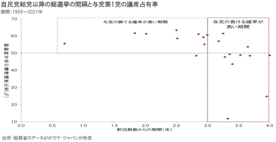 衆議院の任期は4年間である。もっとも、現行憲法下、任期満了で行われた総選挙は1976年12月の1回のみだ。自民党が結党された1955年11月以降の22回で見ると、3年以下の間隔で行われた10回のうち、9回で解散時与党第1党が過半数を確保した。一方、3年超で行われた12回では、8回で与党第1党は過半数を得られていない。内閣総理大臣にとって、概ね2年の間隔で解散するのが政権維持の要諦と言えよう。