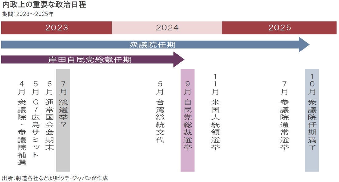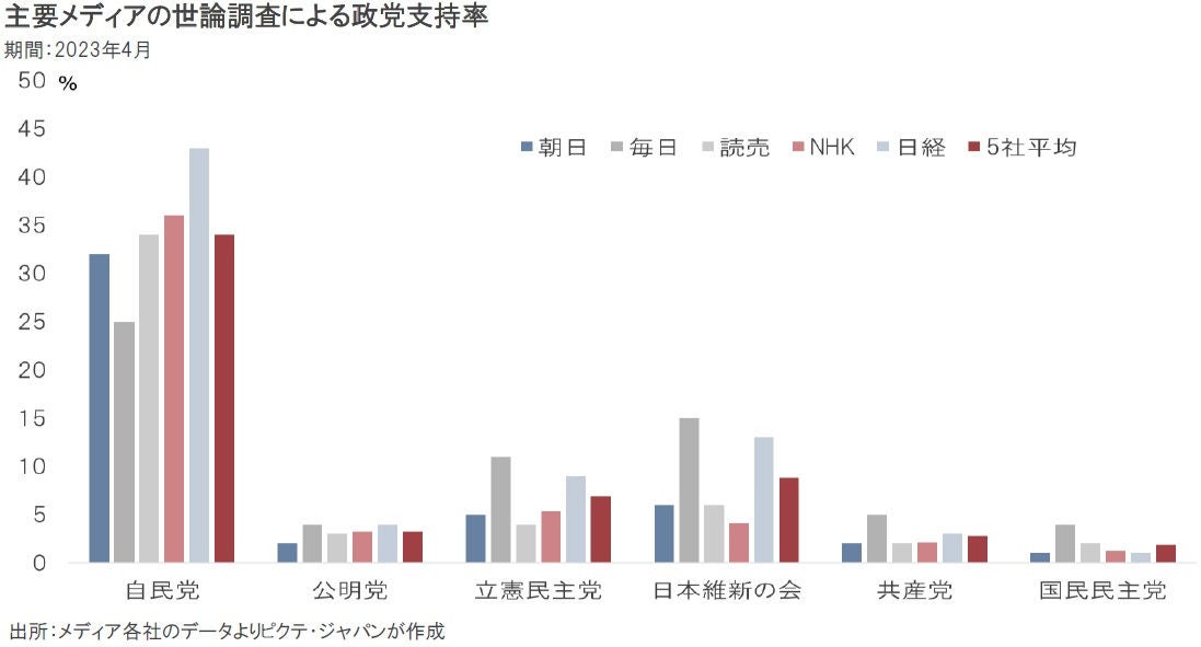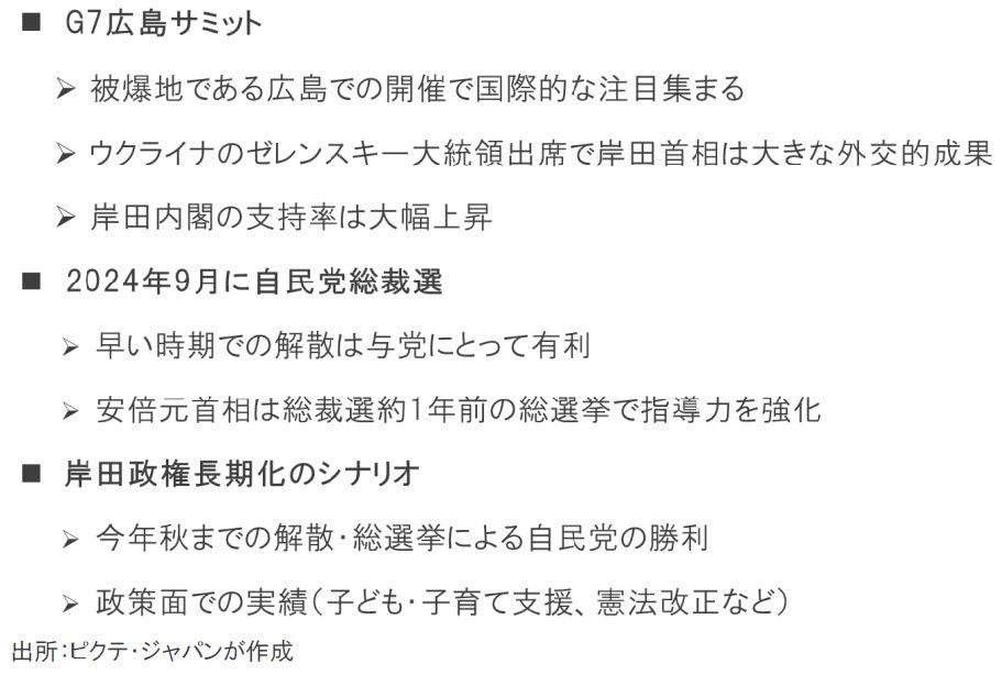 最近の報道各社の世論調査を見ると、自民党の支持率が高水準で安定しているのに対し、野党は一般に勢いに欠ける。また、野党側は総選挙へ向け候補者の擁立が遅れている上、各党間の選挙協力も進んでいない模様だ。統一地方選挙で躍進した日本維新の会は総選挙でも議席を伸ばす可能性はあるが、他の野党は厳しいだろう。自民党にとっては、総選挙を実施するのに有利な状況と言える。