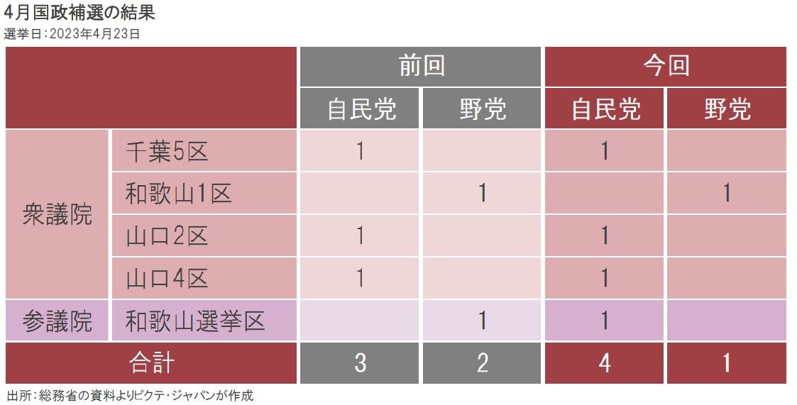 統一地方選挙後半戦に合わせて4月23日に行われた5つの国政補選において、自民党は議席を1増やし4勝1敗とした。各選挙を詳しく見ると、複数で僅差の勝利だったことは間違いない。ただし、補選は数が限られる一方、総選挙は289小選挙区で戦わなければならない。総合力が問われるため、地方議員を多く抱える自民党、組織力の強い公明党が有利になる傾向がある。補選の結果は参考に過ぎない。