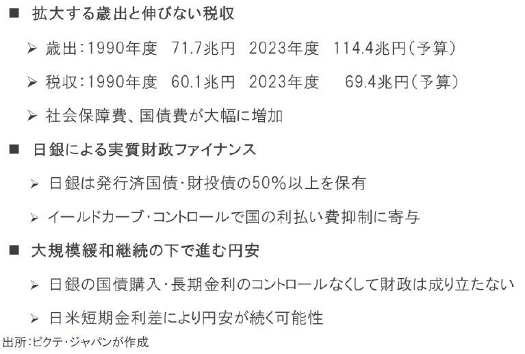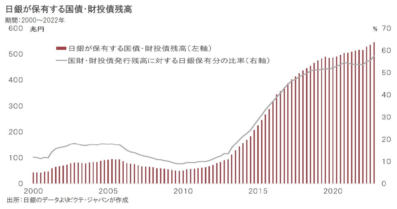 税収の伸びを大きく上回る歳出の拡大を長期に亘って国債発行で賄えてきたのは、2013年4月4日の政策決定会合で量的質的緩和を決めた日銀の存在が極めて大きい。ゼロ金利政策の下で実質的な財政ファイナンスを続けて来たことにより、政府は安定消化を懸念することなく国債を発行することが可能になった。その結果として、日銀の保有する国債及び財投債は発行残高の50%を大きく上回っている。