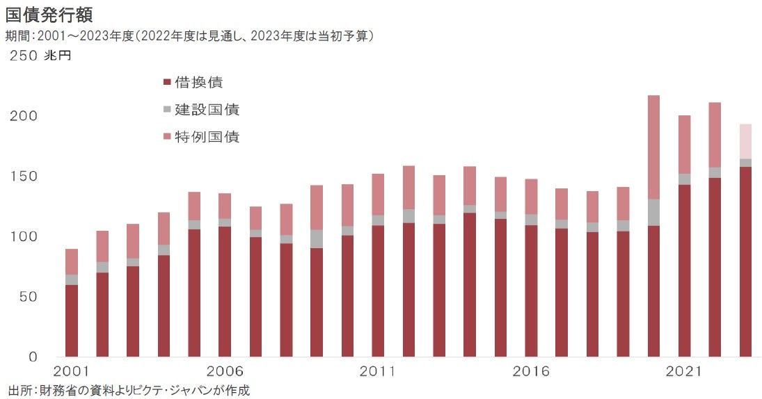 ■ 新規財源債と借換債で年間の国債発行額は200兆円前後に達する