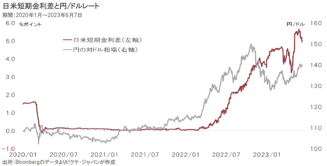 4月10日の就任会見で植田日銀総裁は大規模緩和の継続に強い意欲を示した。結果として、海外ファンドによる円調達が復活、為替は円安へ傾斜している。FRBの利上げが打ち止めになるとしても、日米には5%の短期金利差があり、「円調達・ドル運用」の流れが続くのではないか。日銀が金融政策を変更するとすれば、円安の加速により輸入物価が上昇し、国民の不満が高まるケースと想定される。