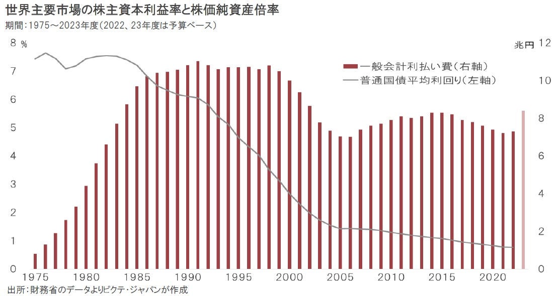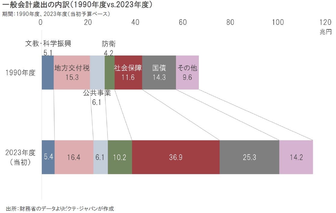 バブル経済の絶頂期であった1990年度と比較した場合、2023年度(当初予算)の一般会計歳出の主要項目のうち、文教・科学振興費、地方交付税、公共事業費などはほとんど増えていない。しかし、一般会計歳出は、1990年度の69兆2,687億円から114兆3,812億円へと45兆1,125億円増加した。この増額分のうち、社会保障費が25兆2,503億円、国債費が10兆9,361億円に達している。