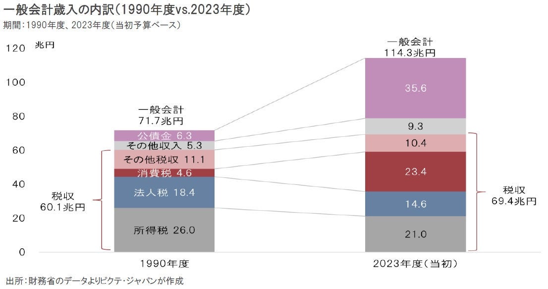 2023年度予算の歳入は、基幹3税のうち所得税、法人税が1990年度を下回っている。これに対して、消費税は税率が3%から10%へ引き上げられたことにより、18兆7,613億円増加した。結果として基幹3税合計の税収は9兆3,341億円増える見込みだ。それでも、歳出の増加を埋めきれず、新規財源債の発行額は6倍弱になった。消費税率を引き上げる以外、収支を均衡へ近づける方法はないだろう。