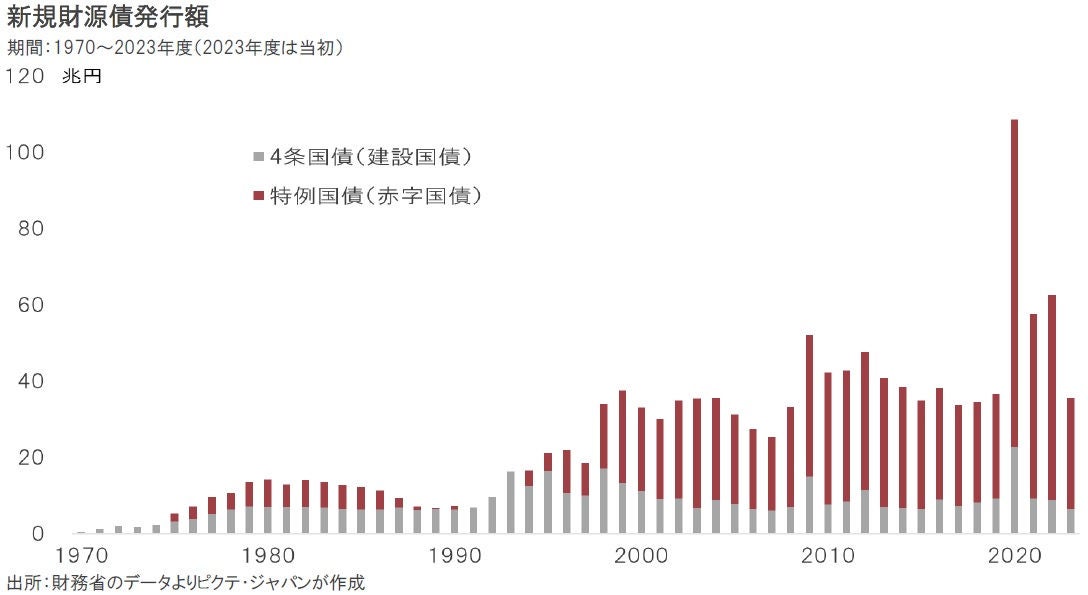 財政法第4条は原則として国債の発行を禁じているが、ただし書きにより建設国債の発行を認めた。もっとも、第1次石油危機以降、公債発行特例法を制定することにより赤字国債の発行が解禁になっている。2023年度までの直近10年間だと、建設国債が合計で93兆5,291億円発行されたのに対し、特例国債の発行額は386兆7,594億円に達した。一般会計の公債依存度は加重平均ベースで42.6%だ。