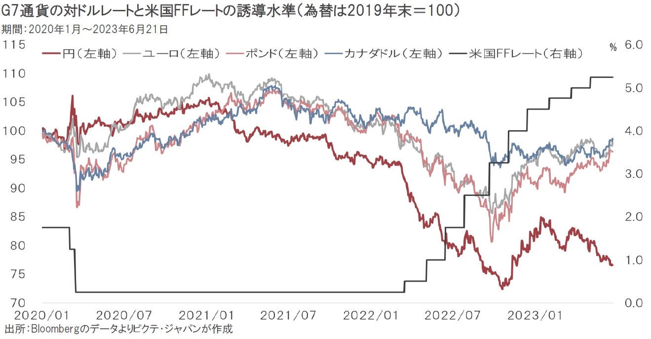 ドルの独歩高は、昨年3月15、16日のFOMCでFRBが利上げを決めたことが転換点に他ならない。米国との金利差を背景に、主要通貨が軒並み下落局面となった。ただし、FRBに追随してカナダ中央銀行、ECB、BOEは利上げを開始、カナダドル、ユーロ、英ポンドは下落に歯止めが掛かっている。各国・地域でインフレ圧力が強まるなか、通貨価値の防衛も金融政策の重要な要素になったと言えるのではないか。
