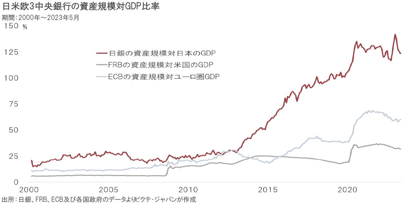 購買力平価が機能していないのは、相対的な円の過剰供給が理由と考えられる。10年以上に亘る大規模緩和の結果、日銀の資産規模はGDPに対して123.8%になり、31.7%のFRB、60.2%のECBを大きく上回った状態だ。マネタリーベースが経済規模に比して過剰に供給されており、正常化のメドは立っていない。円の理論値を考えるに際しては、この過剰供給分を加味する必要があるのではないか。