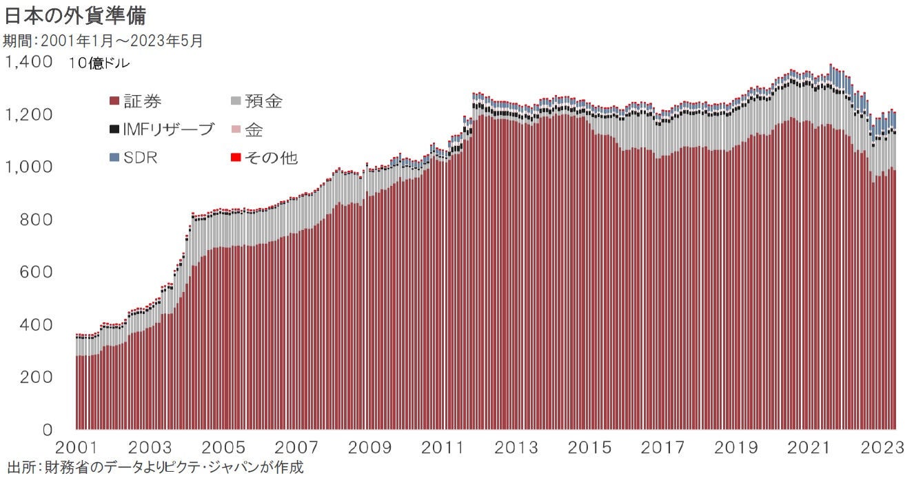 ドル売り介入の場合、財務省が売るためのドルを保有している必要がある。つまり、原資は原則として外貨準備だ。5月末現在、日本の外貨準備残高は1兆2,545億ドルだが、78.8%に相当する9,881億ドルは外債だった。ドル売り介入には、米国国債の売却を含めて米国政策当局の同意が必要だろう。また、巨額の円売り介入を続けた場合、外貨準備が減少するため、むしろ円の下落要因になりかねない。