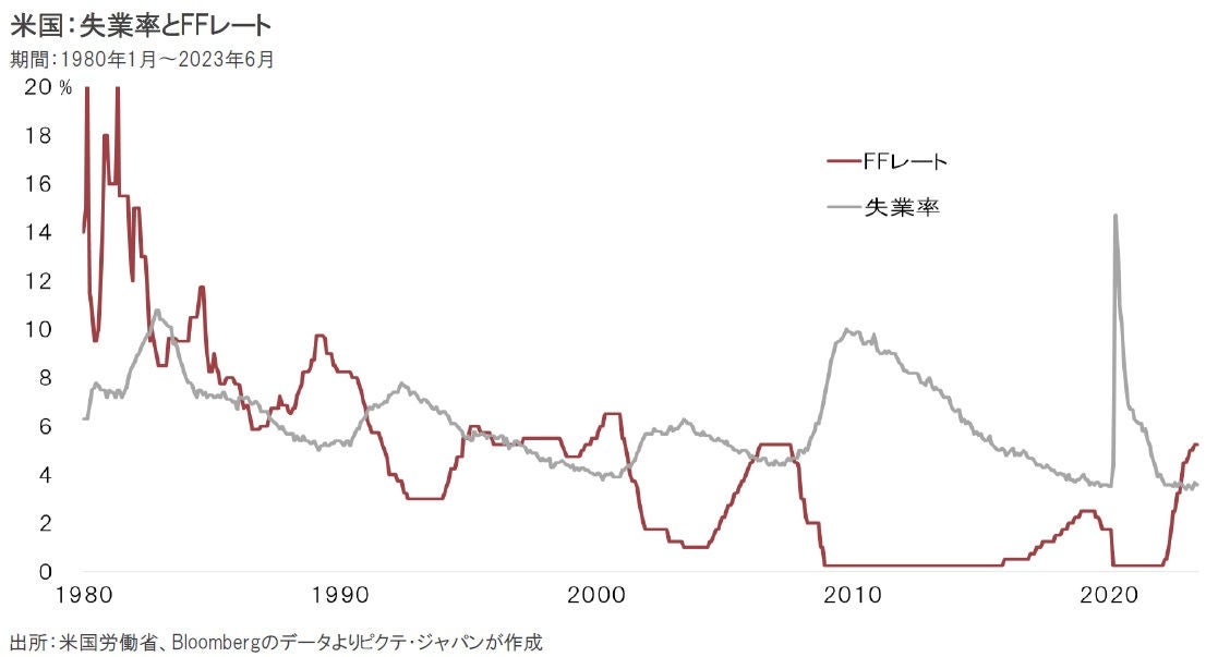 連邦準備制度法によれば、FRBによる金融政策の目的は、「雇用の最大化」と「物価の安定」のデュアルマンデートだ。従って、金融政策の変更に当たって、FRBは物価と共に雇用関連の指標も重視してきたと見られる。そうした観点から失業率とFFレートの関係を振り返ると、本格的な金融引き締めが行われた6回とも、例外なく最後に利上げが行われた時点で失業率は既に底入れ期に入っていた。