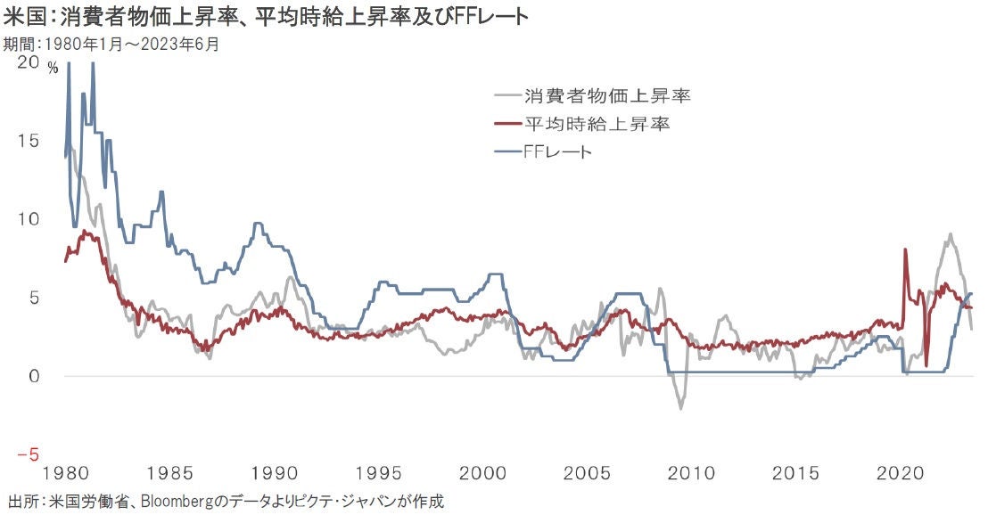 1980年代初頭のインフレ期における量的引き締め局面から米国の金融政策が脱却、FFレートが再びFRBの政策目標になり、金融政策が正常化して以降、主な利上げ局面は6回ある。その終了時点の経済状況を見ると、例外なく消費者物価上昇率がピークアウトしていた。また、FFレートの水準は何れも消費者物価上昇率を上回っている。さらに、直近3回については、実質賃金の伸びがプラスだった。