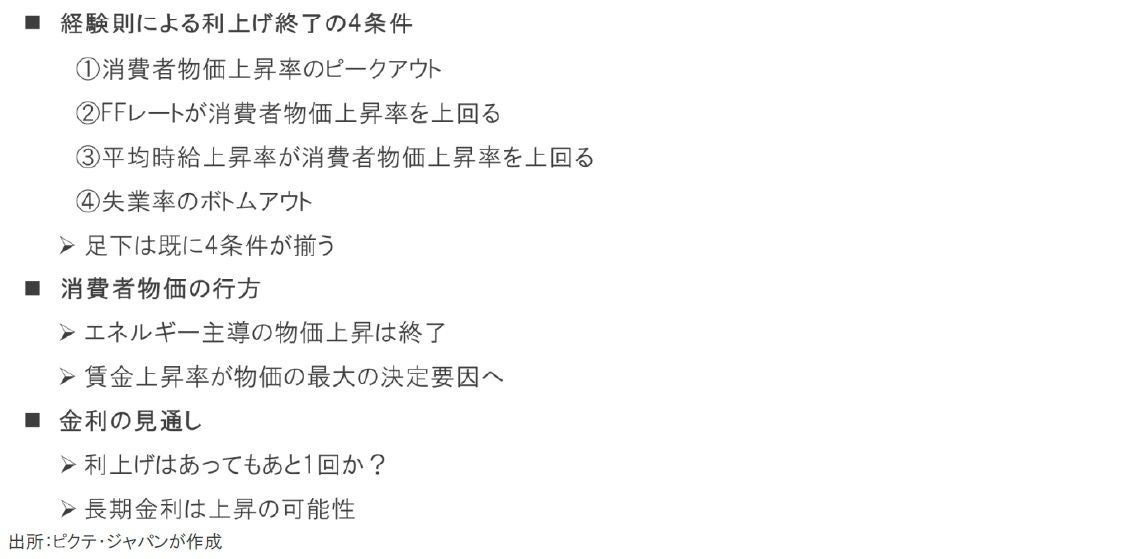 ■ 利上げ終了の条件:①CPI頭打ち、②FFレート>CPI上昇率、③実質賃金>0%