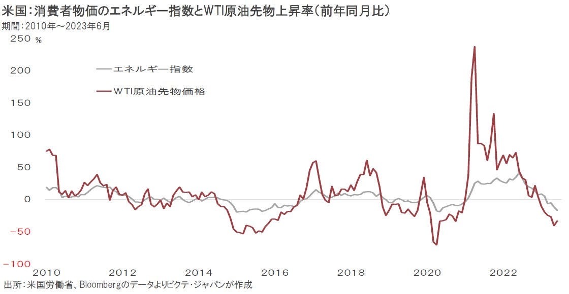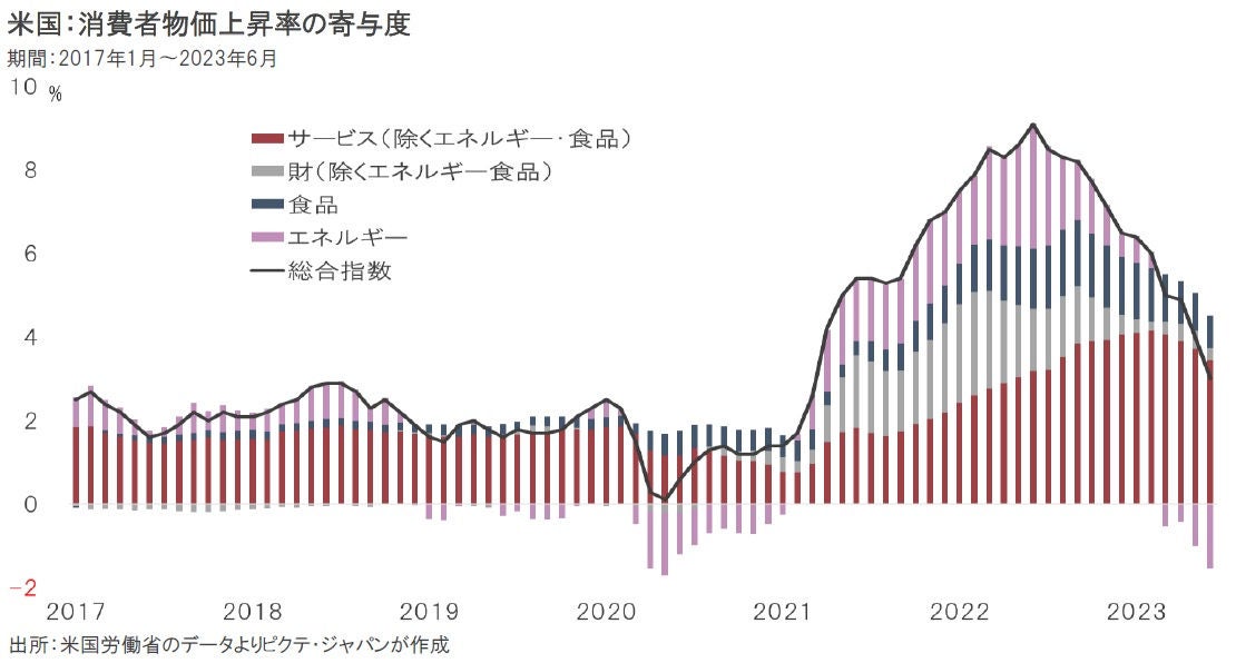 6月の消費者物価統計では、総合指数の上昇率が前年同月比3.0%と2021年3月以来の低水準だった。もっとも、エネルギー、食品を除くコア指数は同4.8%上昇している。昨年6月、総合指数の上昇率は9.1%だったが、この時はエネルギーの寄与度が+3.0%ポイントに達していた。一方、今年6月の場合、エネルギーの寄与度は▲1.5%ポイントだ。原油価格などの落ち着きが、米国においてインフレ圧力が弱まった要因だ。