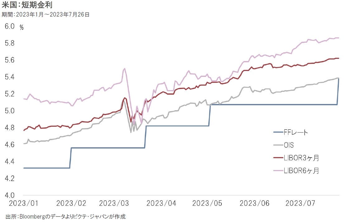 足元、LIBOR1ヶ月物の利回りは5.530%、3ヶ月物は5.619%であり、そこから算出される1ヶ月後から3ヶ月後までの2ヶ月間のフォワードレートは5.688%だ。一方、現在のFFレートの誘導水準の中心は5.375%なので、さらに0.25%の利上げがあれば5.625%になる。フォワードレートがその水準に近いことから、マーケットは9月のFOMCでさらに25bpの利上げがある可能性に備えていると言えよう。