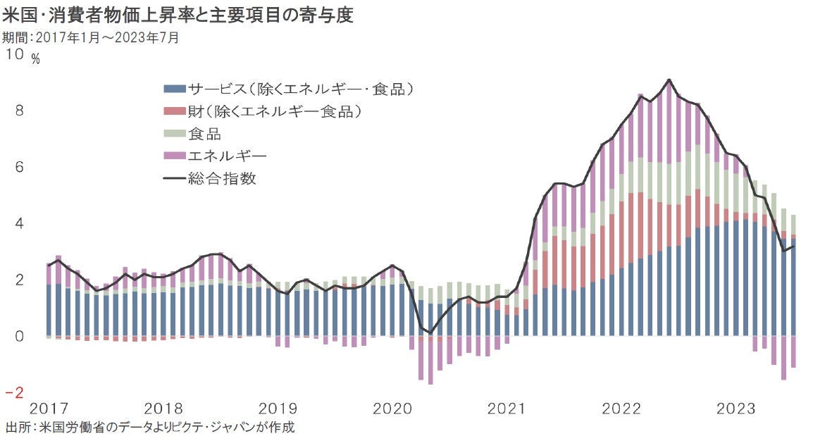 昨年6月、米国の消費者物価上昇率が前年同月比9.1%を記録した際には、エネルギーの寄与度が+3.0%ポイントに達していた。一方、原油価格が低下したことにより、今年7月のエネルギーの寄与度は▲1.1%ポイントになっている。現在、実質賃金の伸びがプラスになり、米国経済の基礎的条件としては悪くない状態だ。この状態を維持するには、原油価格の安定が重要な条件と言えるだろう。