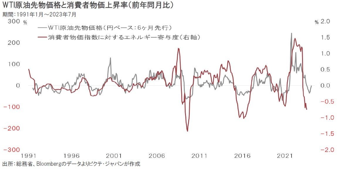 日本の消費者物価上昇率が今年1月の前年同月比4.4%を天井にやや落ち着きを取り戻したのは、米国と同様、エネルギー価格の下落が主な理由だ。もっとも、9月に入って以降の原油価格、為替の動きにより、円建ての原油価格は前年同月比11%程度の上昇に転じた。この状態が続けば、2024年の年明け頃から日本の物価にも影響が出るだろう。それが国債売り、円売りの要因となるリスクが懸念される。