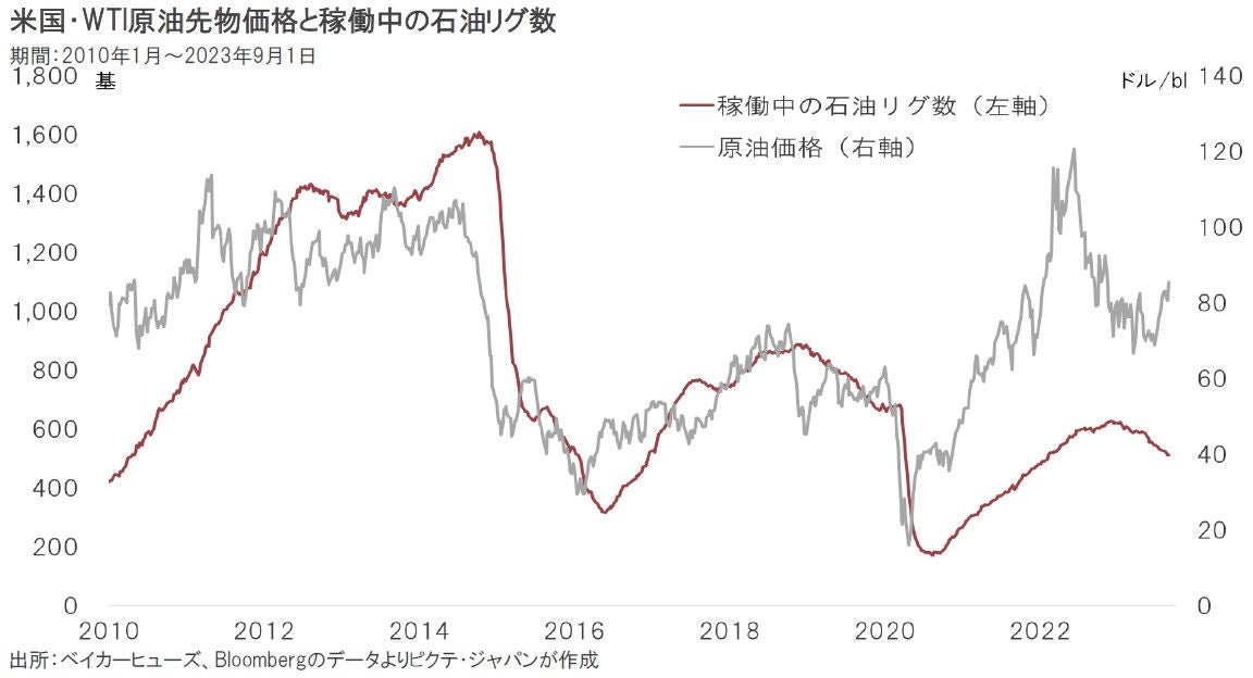 2010年代に入っての米国におけるシェール革命により、原油市況は2016年に急落した。その後もシェールオイルは生産を拡大、2019年に米国は世界最大の産油国になったのである。しかしながら、足元、シェールオイルの増産ペースは緩慢だ。バイデン政権が環境政策で油田開発を抑制している上、優良な鉱床は既に開発が進んだことが要因と見られる。シェールオイルの大幅増産は難しいだろう。