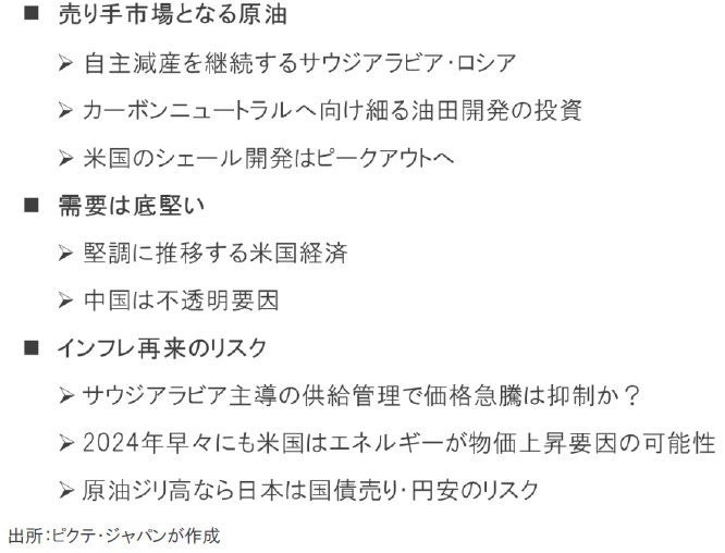 原油価格がジリ高歩調をたどっている。直接的な要因は、主要産油国であるサウジアラビアがロシアと共に供給量を調整していることだ。供給国側に市場をコントロールする主導権が移行したのは、多くの国・地域がカーボンニュートラルを目指すなかで、化石燃料は長期的に需要の先細りが予想され、新規の資源開発が滞りつつあることだろう。また、2010年代に急速に生産が拡大した米国のシェールオイルは、バイデン政権の環境政策に加え、有望な鉱床の開発が既に峠を越えたと見られ、大幅な増産は期待できなくなった。一方、化石燃料需要は直ぐには減らないため、石油は売り手市場になっている。2024年11月の大統領選挙で再選を目指すジョー・バイデン大統領にとり、エネルギー価格の抑制によるインフレ圧力の緩和は必須の課題であり、サウジアラビアとロシアの連携は頭の痛い問題だろう。また、日本経済にとっても、原油のジリ高が続けば、物価上昇圧力が高まり、国債売りと円売りの懸念が高まりかねない。リスクシナリオとして注意が必要ではないか。