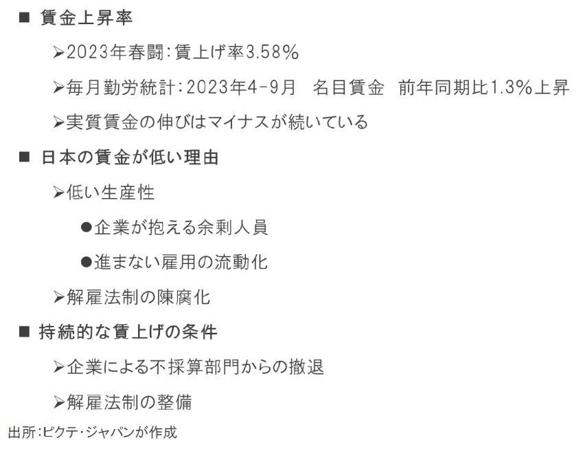 2023年春闘での賃上げ率は3.58%だったものの、実際の賃金上昇率は依然として低水準であり、消費者物価上昇率に追い付いていない。春闘は定期昇給を含む上、集計の対象が日本労働組合総連合(連合)に所属する一部の労働者に限られるからだ。国際的に見ると、実質賃金は労働生産性に比例する。日本の賃金がOECD加盟国で26番目と低いのは、日本の労働生産性が低水準だからだろう。また、雇用の流動性が高い国ほど実質賃金の上昇率が高い。つまり、雇用の安定と賃上げ率はトレードオフの関係にある。これまで、日本は終身雇用制度に象徴される雇用の安定を重視、結果として賃上げ率が抑制されてきたと言えるのではないか。また、日本企業は余剰人員を抱えていることも、企業側が固定費としての人件費の抑制に腐心してきた要因と言えそうだ。持続的な賃上げを実現するには、人材の流動化が喫緊の課題だろう。政治には労働法制の大胆な見直し、企業には選択と集中、柔軟な雇用・賃金システムへの移行が求められる。