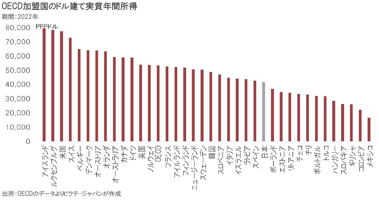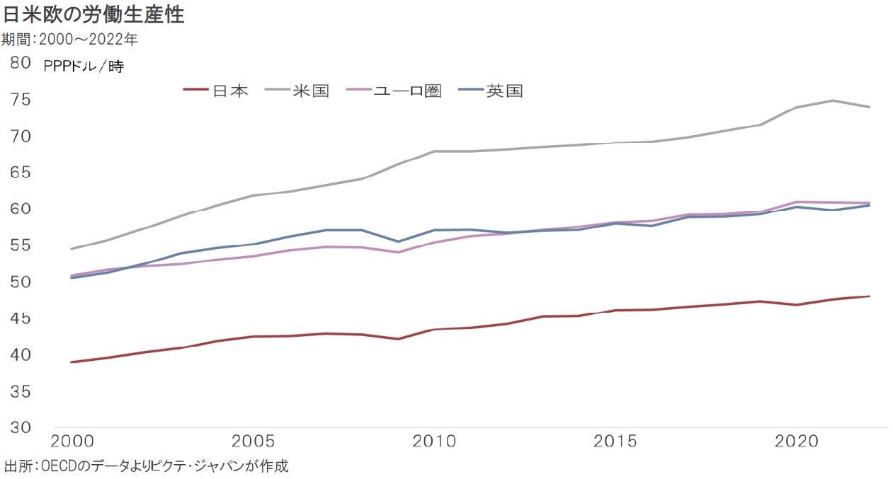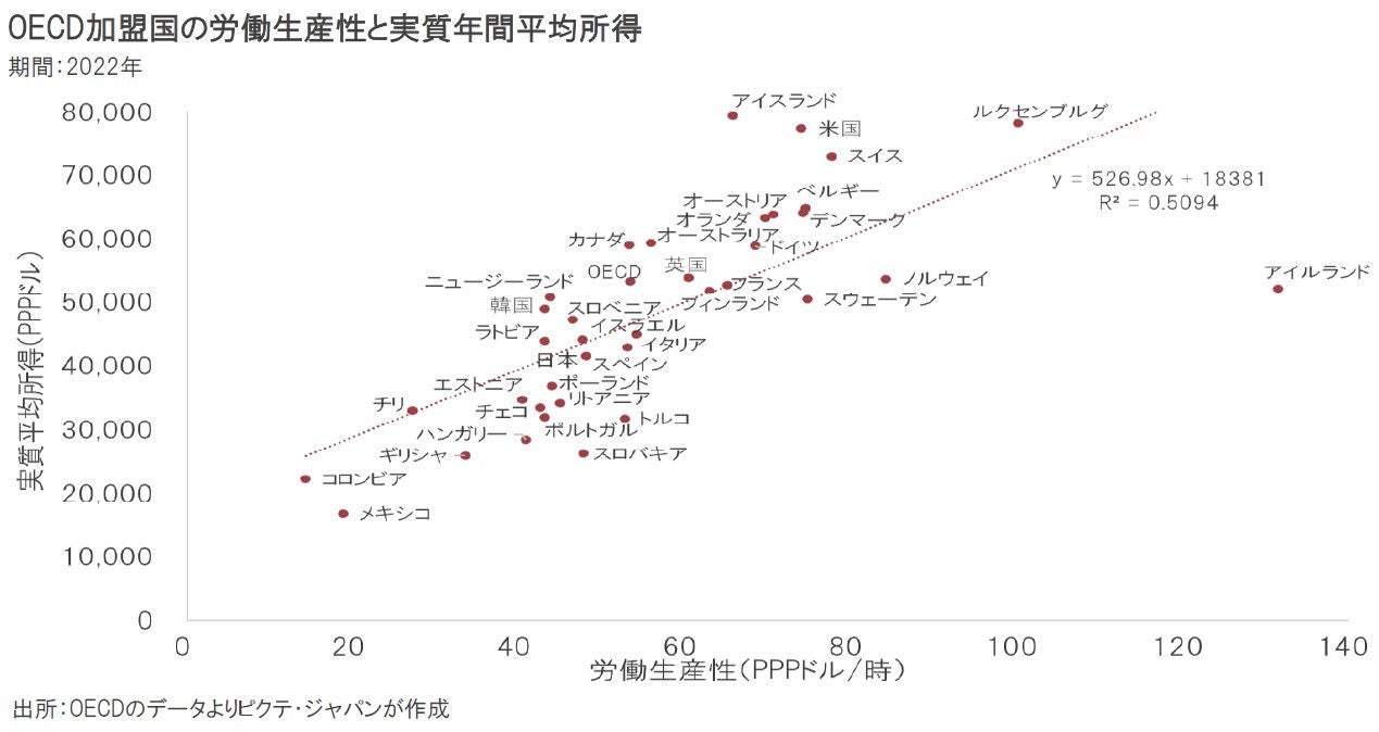 OECD加盟国の実質平均所得は概ね労働生産性に比例する。日本の場合、生産性がOECD平均の90.1%、G7平均の74.8%に過ぎず、それが相対的に低い賃金の背景に他ならない。労働生産性は労働者1人が1時間働いた際に生み出す付加価値(=GDP)なので、賃金が連動するのは極めて合理的と言える。つまり、岸田政権が目指す「賃金と物価の好循環」の前提は、日本の労働生産性の改善が必須の要件だろう。