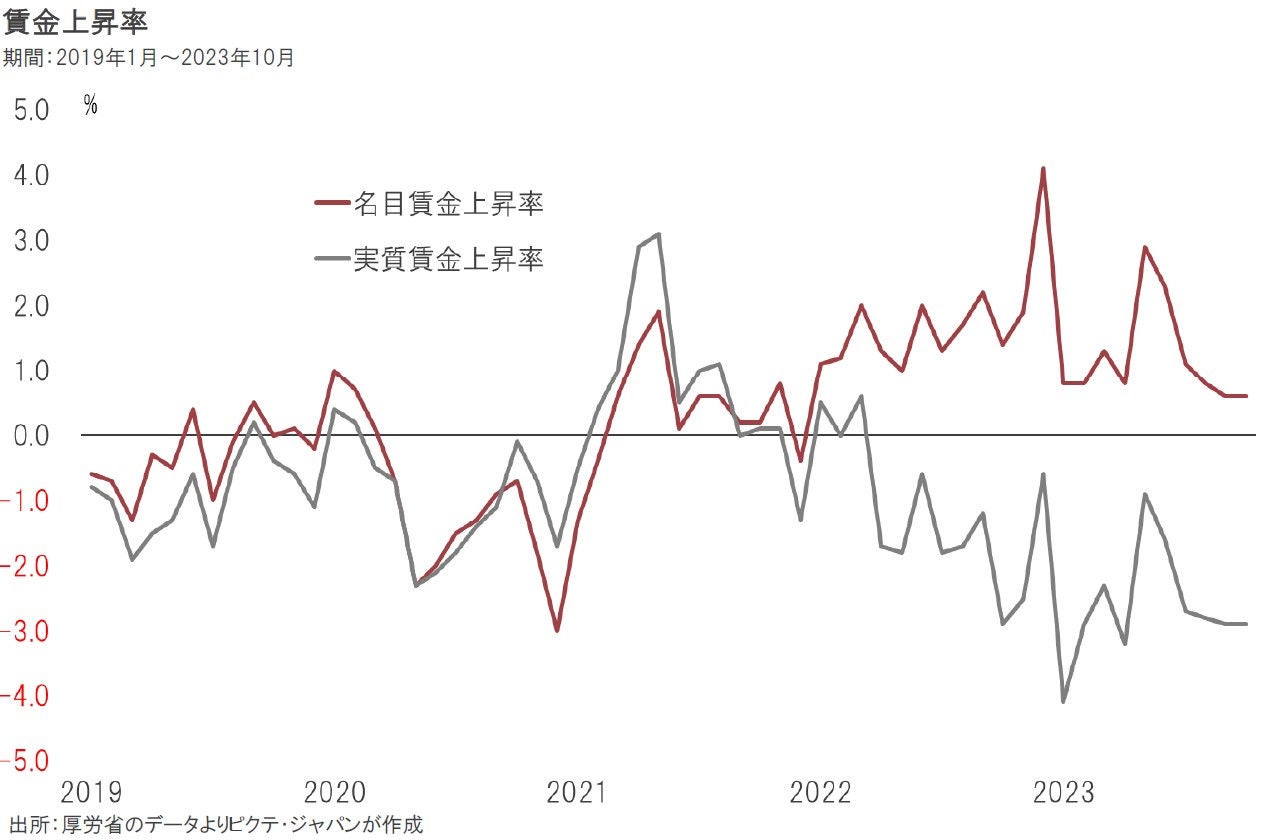 厚生労働省の毎月勤労統計によれば、9月、給与所得は名目で前年同月比0.6%の上昇だったが、実質だと2.9%のマイナスだった。連合の集計では、春闘における賃上げ率は3.58%だが、実際の名目賃金はそこまで伸びていない。理由の1つは、「3.58%」がベースアップと定期昇給を含んでおり、相対的に賃金の高いシニア層が定年などで退職することにより、全体の定昇分が相殺されていることだろう。